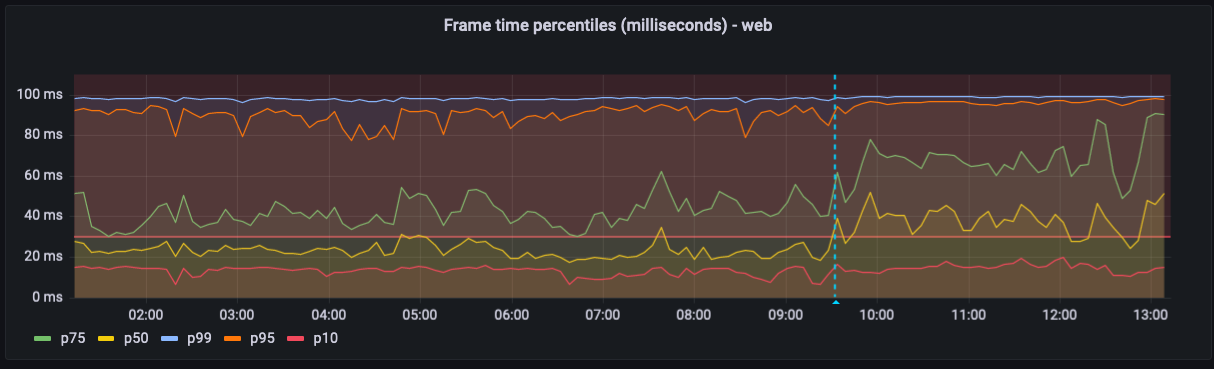 The following graph contains the percentiles of the frame rates of all web sessions. The cyan line marks a testing moment in which all sessions got a "unlimited" rendering resolition, matching their systems DPI. Prior to that line, all sessions were using a Low DPI setting. In which one canvas pixel represents one pixel of the screen.